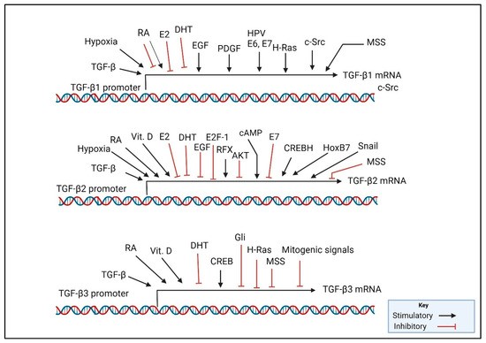 图1. TGF-β1、TGF-β2和TGF-β3转录表达的调控因子。