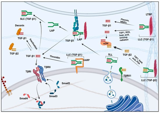 图 2. TGF-β 在细胞内和细胞外环境中的复杂激活过程。