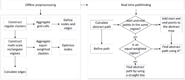 经典的 A* 算法虽然能保证找到最优路径,但在大范围地图中搜索效率会急剧下降;而已有的分层路径规划算法 (如 HPA*) 虽然提升了效率,但生成的路径与最优路径偏差较大,且在存在大量连续统一地形 (如草原) 的环境中,会将这些区域不必要地分割,反而降低了效率。