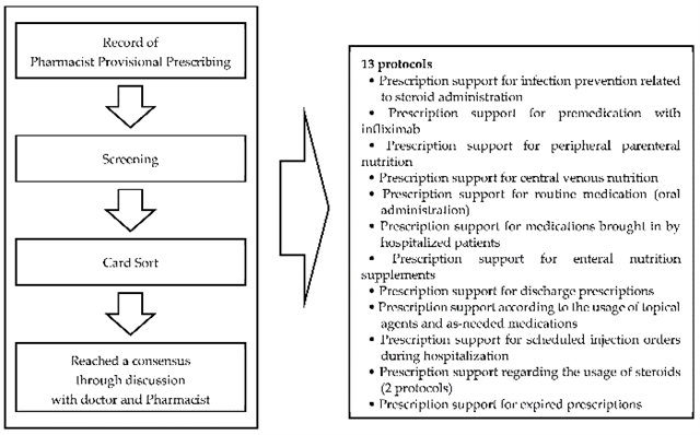 本研究为一项基于处方的回顾性分析。研究基于日本柏之叶辻仲医院炎症性肠病中心的诊疗实践,旨在制定额外的基于标准化方案的药物治疗管理协议。研究首先回顾了2021年10月至12月期间药剂师根据医师口头指示开具的临时处方记录,由IBD团队的两名药剂师从中筛选出具有普适性且明确的处方指令,采用开放式卡片分类法进行归类,并基于类别标签制定可操作的协议草案。草案经IBD团队的药剂师与医师在2022年1月多次审阅修订,以确保其准确反映医师意图并具备临床可行性,最终依据医院规定将其正式确立为新的PBPM。