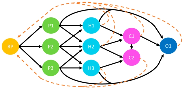 第二个案例研究基于 Pawlowski 等人的研究,并在文中的图 3 中以图形方式呈现。该模型采用营养结构,包含一个非生物资源库 (RP)、三种不同类型的植物(P1、P2 和 P3)、三种食草动物(H1、H2 和 H3)、两种食肉动物(C1 和 C2)以及一种杂食动物 (O1)。与之前的模型不同,在本案例研究中,各个组成部分在一个封闭的质量系统中同时扮演着猎物和捕食者的角色。物质平衡通过将废物重新整合回营养库 (RP) 来维持。文中图 2 中,实线表示物种间自然消耗的流动,这在生态系统的食物链中很常见;而半连续线则表示在组成部分死亡或产生自然废物后,物质重新整合回生态系统的过程。