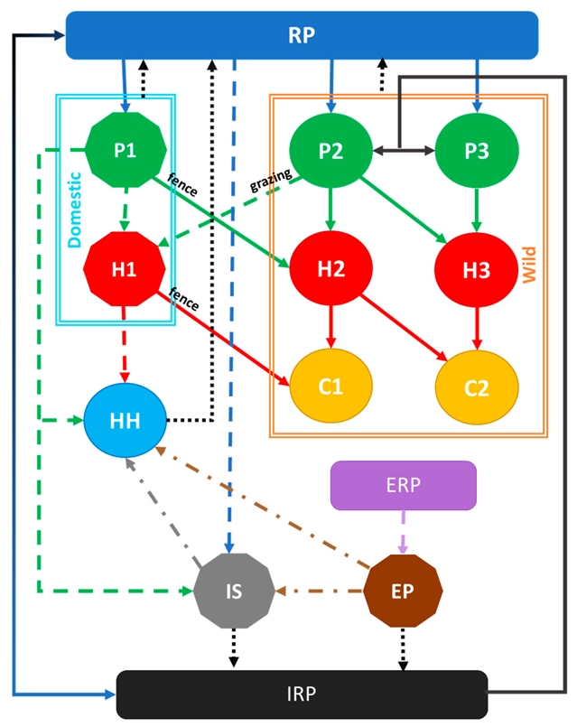 第三个案例研究以Rodriguez-Gonzalez等人提出的模型为基础,该模型如文中图4所示。该结构由14个按营养级划分的隔室组成。在生物层级中,隔室分为两类:家养隔室,包括农业部门(P1)和畜牧部门(H1);以及野生隔室,后者包括与人类直接互动的隔室,例如草地(P2)、食草动物(H2)和食肉动物(C1),其中后两者捕食家养隔室;以及不与人类直接互动的隔室,例如植物(P3)、食草动物(H3)和食肉动物(C2)。另一方面,非生物层级由三个资源库表示:初级资源库,为营养链提供必需资源(RP);次级资源库,代表废物处理(IRP);以及第三级资源库,代表能源资源(ERP)。最后,人类层面包括人类家庭(HH)、能源部门(EP)以及工业和服务部门(IS)。