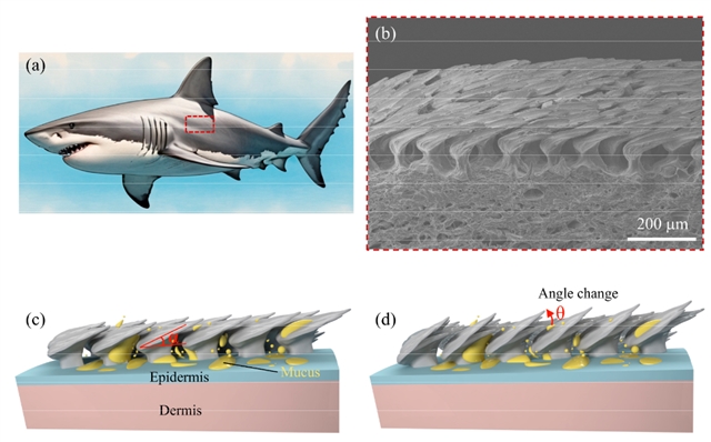 鲨鱼,作为海洋中的高效游泳者,其皮肤结构一直备受科学家关注。研究发现,鲨鱼皮肤表面覆盖着数百万个微小的“鳞齿”,这些鳞齿不仅具有减阻功能,还能在游动中主动调节水流、防止逆流。更令人惊讶的是,鲨鱼皮肤表面还会分泌黏液,虽然量少,但其表面张力极低 (约20–30 mN/m),这种粘液的低表面张力可以诱导马兰戈尼推进,促进主动减阻。当与小齿微观结构的流体动力学特性相结合时,这种机制可能会产生意想不到的性能增强,而目前对涉及粘液的主动机制的关注很少,因此需要进一步研究这种仿生主动减阻方法。