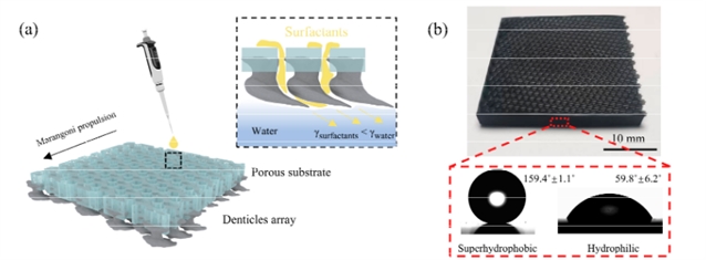 图2:(a) 自推进式马兰戈尼驱动游泳器 (b) 3D打印的自推进式马兰戈尼游泳器照片,其具有交错重叠的齿状阵列,并在游泳器两侧设有超疏水或亲水屏障