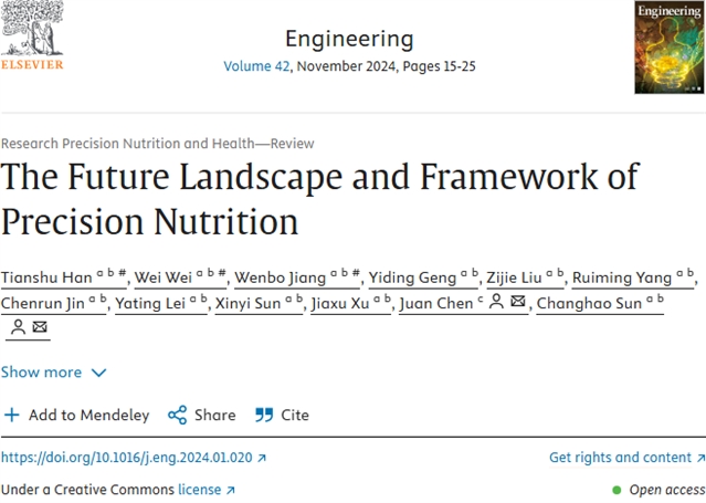 Tianshu Han, Wei Wei, Wenbo Jiang, Yiding Geng, Zijie Liu, Ruiming Yang, Chenrun Jin, Yating Lei, Xinyi Sun, Jiaxu Xu, Juan Chen, Changhao Sun. The Future Landscape and Framework of Precision Nutrition. Engineering, 2024, 42(11): 18-28