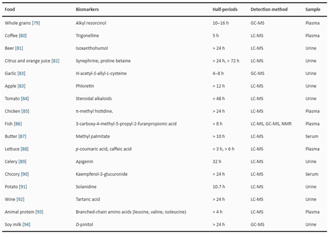 表1 已建立的可以测量食物摄入的生物标志物