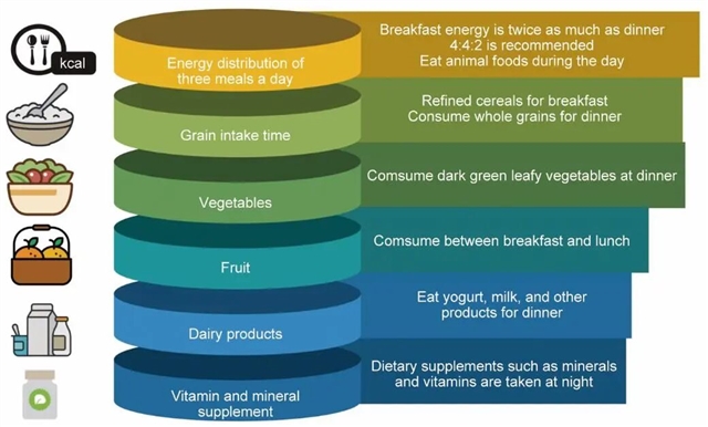 图3 基于目前研究,特定食物和营养素的最佳摄入时间。在每日能量摄入量分配中,早餐、午餐和晚餐的能量分配比例应为4∶4∶2。动物性食物和水果建议在白天摄入,而全谷物、蔬菜、乳制品以及维生素和矿物质补充建议在晚餐时摄入。
