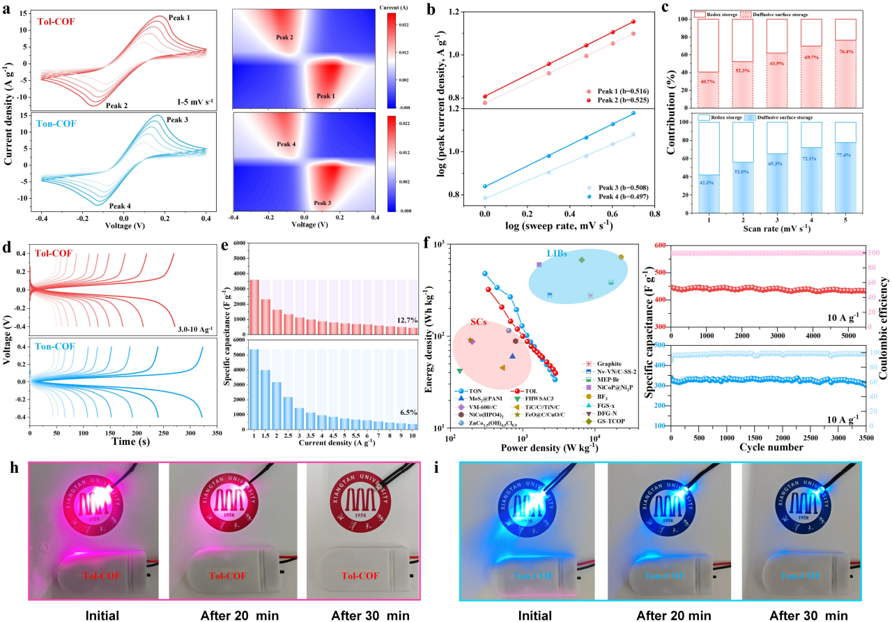 通过改变合成过程中使用溶剂的介电常数,可以获得两种同源异构(化学组成相同,分子结构不同)的三嗪基COFs(Ton-COF和Tol-COF)。因Ton-COF富含对氧化还原活性电解质响应性更强的活性位点(C=O基团和三嗪基团),所组装的KI增强型超级电容器在1 A g−1电流下实现了5378 F g−1的高比电容和478 Wh kg−1的能量密度;而具有分级多孔结构的Tol-COF因具有高效的离子/电子传输通道而表现出更高的倍率性能和循环稳定性。该分子互变异构机制可视为精准调控COFs结构-性能关系的“功能转换开关”,为从分子设计层面定向制备性能差异化的同源异构COFs材料提供了新思路,同时为该类材料在其他领域的拓展应用奠定了理论与技术支撑。