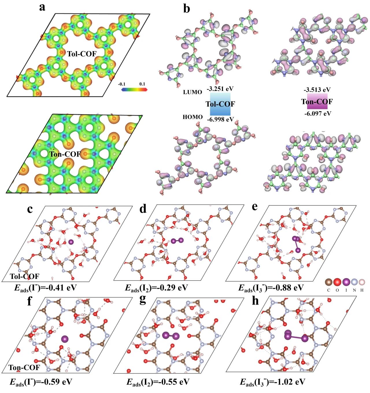 图4:两种同源COFs吸附多碘离子行为的DFT计算。