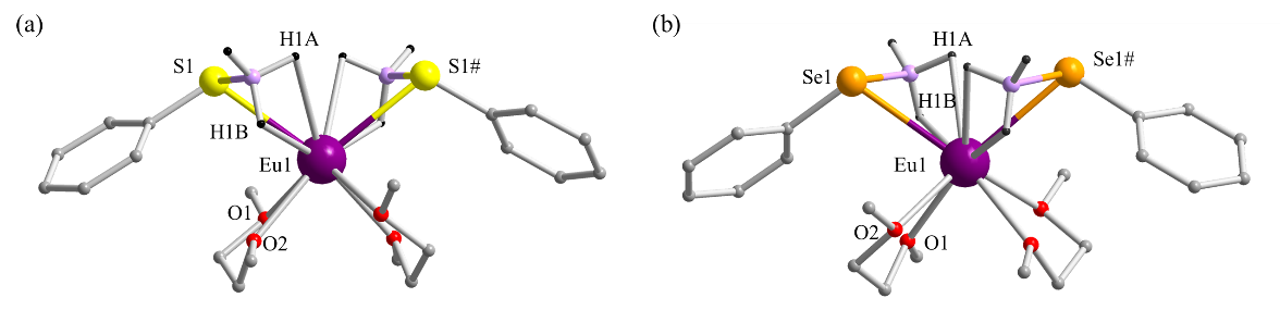 图2. 配合物1(a)和2(b)的球棍模型结构图。紫色:Eu原子;黄色:S原子;金色:Se原子;红色:O原子;灰色:C原子;浅紫色:B原子。# Symmetry code: 1-x, y, 0.5-z.