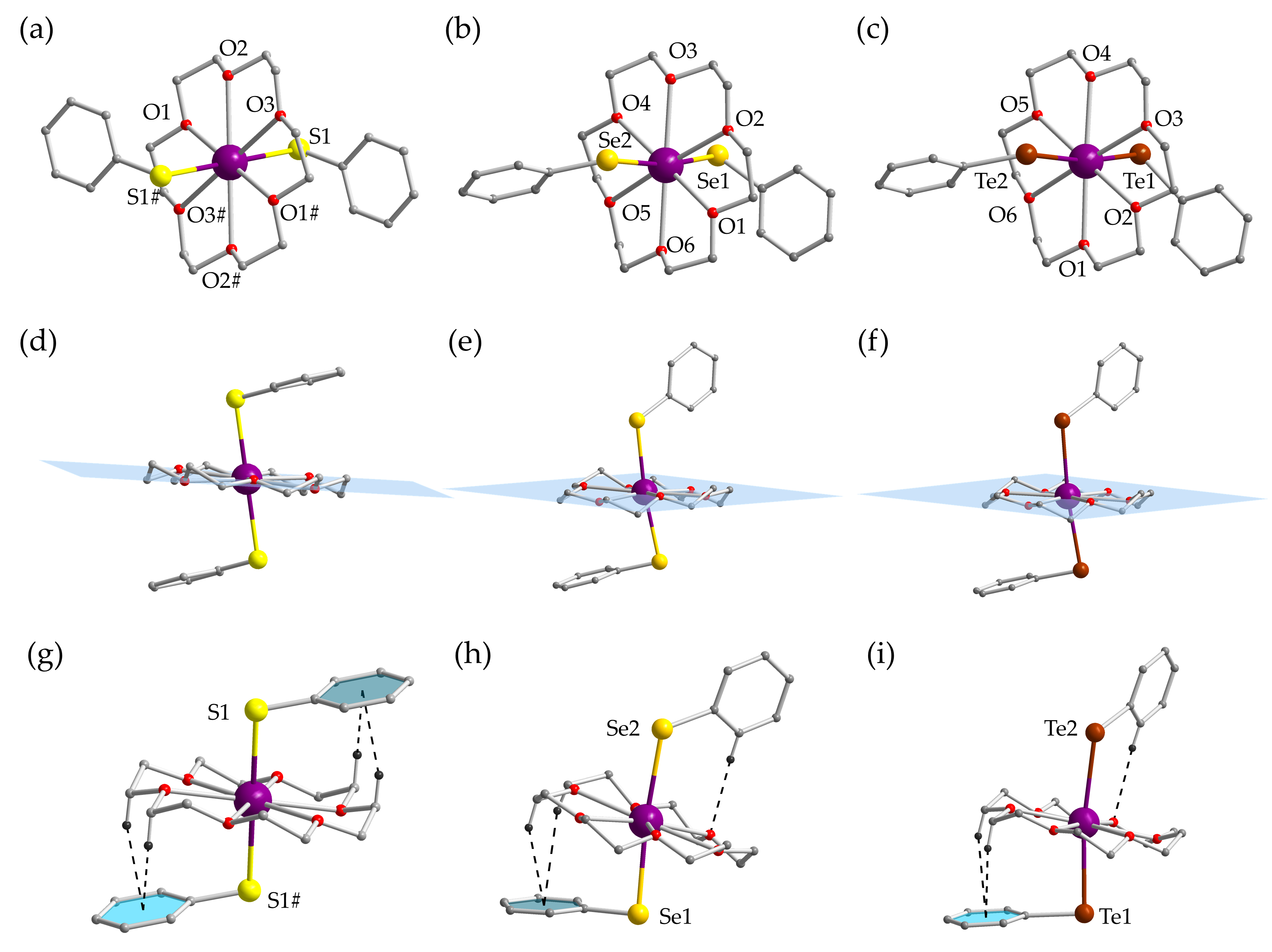 图3. 18-Crown-6配位的单核Eu(II)基硫族配合物3(a)、4(b)和5(c)的球棍模型结构图,3(d)、4(e)和5(f)的侧视图,3(g)、4(h)和5(i)的分子内相互作用。紫色:Eu原子;黄色:S原子;金色:Se原子;橙色:Te原子;红色:O原子;灰色:C原子。# Symmetry code: 1-x, 1-y, 1-z.