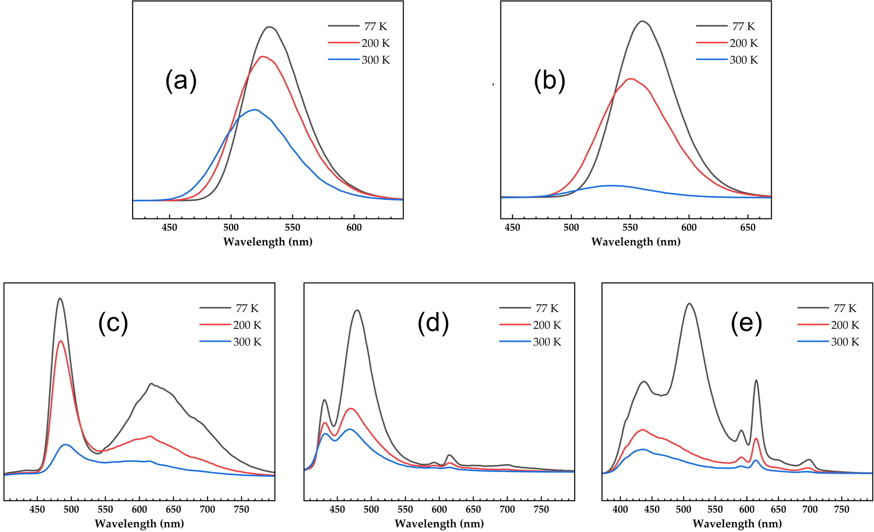 图4. 不同温度下Eu(II)基配合物1(a)、2(b)、3(c)、4(d)和5(e)的荧光发射光谱图。