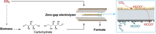 Title: Electron-Efficient Formate Electrosynthesis from CO2 and Biomass-Derived Carbohydrates in a Zero-Gap Electrolyzer