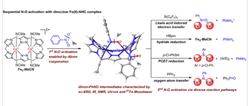 研究组报道了双核铁N-杂环卡宾(NHC)配合物Fe2-MeCN能够实现硝基苯的连续N–O键活化,进而分离并详细表征了两个铁-亚硝基芳烃中间体Fe2-PhNO和Fe2-(PhNO)2。通过光谱学、晶体学研究结合DFT计算,鉴定出极化N–O基团的强电荷转移相互作用。