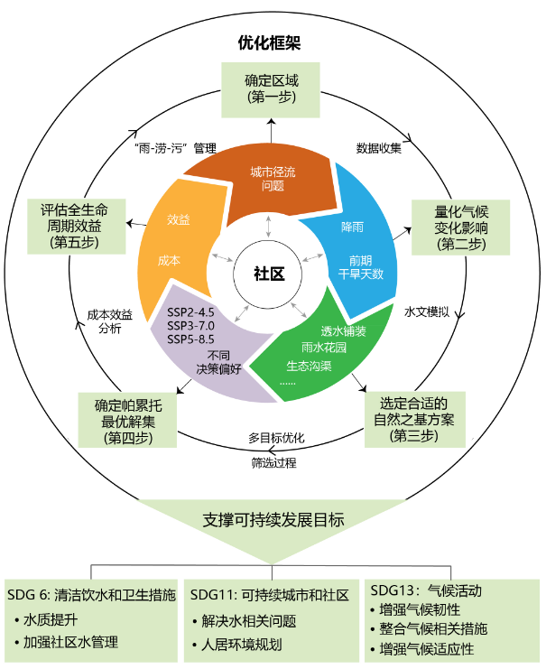 以社区“雨-涝-污”可持续治理为导向,中国科学院城市环境研究所和宁波诺丁汉大学博士生联合培养NBS项目团队以帕累托最优(Pareto Optimality)为理论基础构建了面向气候适应的多目标优化框架(图1)。该框架以社区“雨-涝-污”问题高度关联的3项SDGs(6, 11, 13)为目标维度,形成包含五步骤的双环路径。其中,第四步为在不同共享社会经济路径(Shared Socioeconomic Pathways,SSP)气候情景下对径流削减、总氮去除和成本最低三个目标维度进行优化,即通过非支配排序遗传算法进行全局寻优,由此得到帕累托最优解集。帕累托最优解集中的每个方案,均无法不以弱化其它目标为条件单独强化任一个目标。优化框架、最优解集和案例场景等相关成果以Climate adaptation framework for advancing community stormwater management为题发表于《Environmental Science & Technology》。