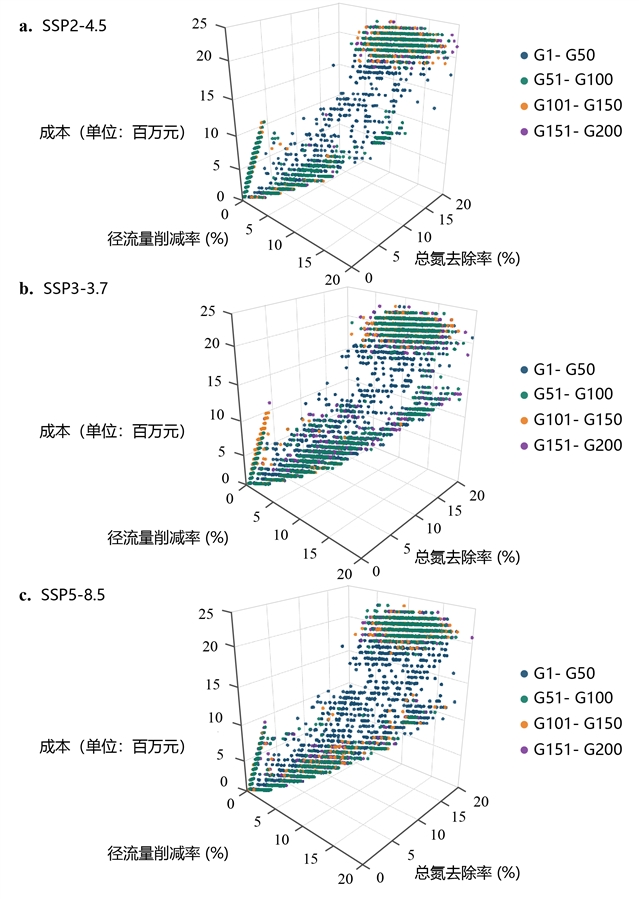情景分析表明,在SSP2-4.5、SSP3-3.7和SSP5-8.5情景下,利用非支配排序遗传算法分别得到7118、9435、9505个NBS配置帕累托最优集(图2)。SSP2-4.5情景下,随着径流量削减与总氮去除率的提升,成本显著上升(图2a);SSP3-3.7情景下,径流量削减与总氮去除率均有所提高,但边际效益递减更为明显(图2b);SSP5-8.5情景下,径流量削减与总氮去除率加大,成本明显增加(图2c)。总体来看,随着气候情景排放强度升高,实现更高削减目标所需投入相应加大。