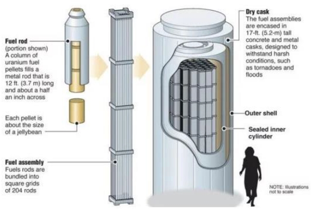 研究指出,当前的核废料处理正从单一的临时贮存(如图所示干式贮存桶)向更先进的闭环燃料循环发展。目前主流的PUREX(钚铀还原萃取)水法后处理技术已能有效回收乏燃料中的铀和钚,并将其混合制成新的MOX(混合氧化物燃料)再次投入热中子反应堆使用。这不仅能节约约20%的天然铀资源,还能将高放废物的总体积减少约3.5倍。