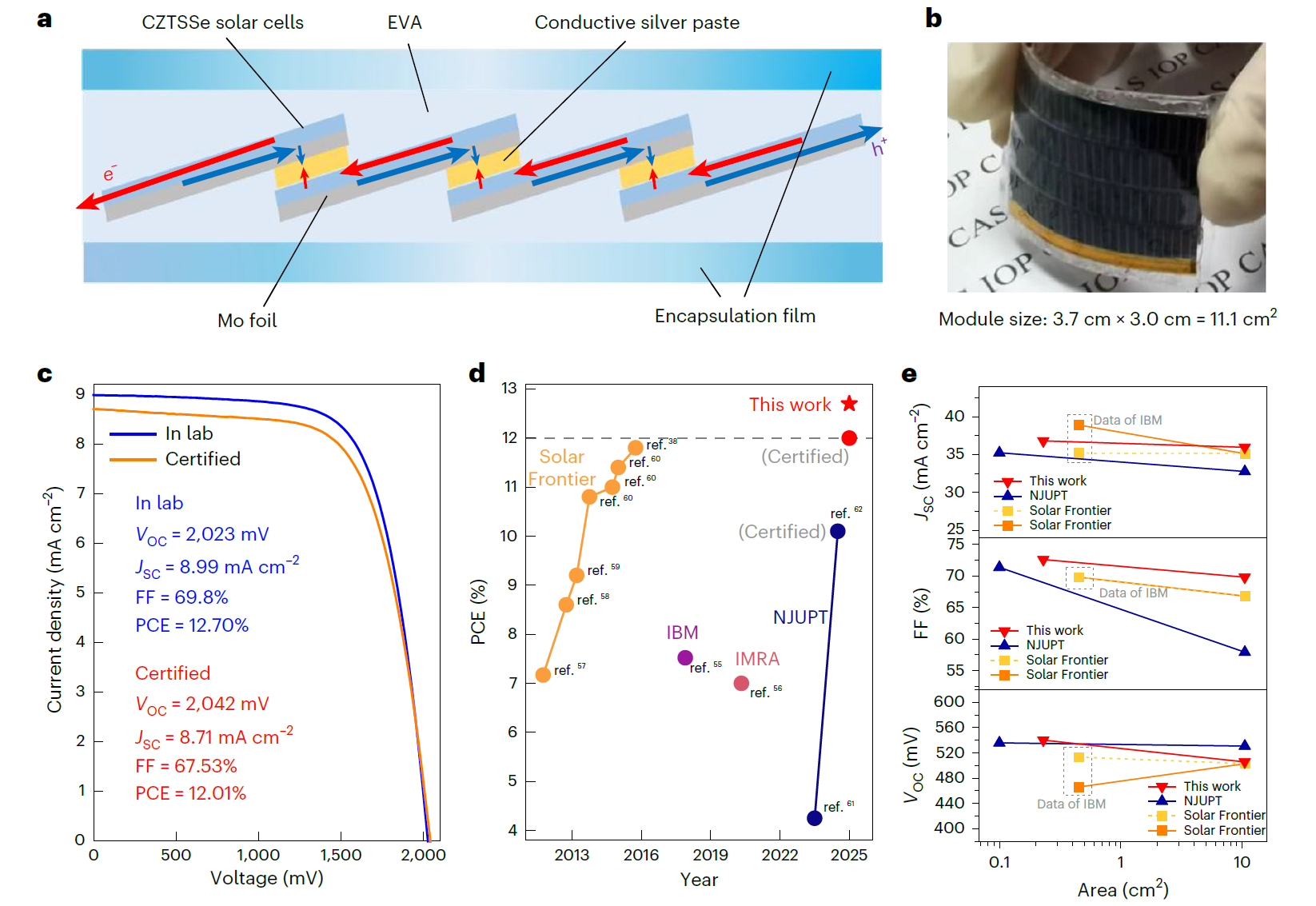 图3:基于叠瓦技术的CZTSSe柔性组件实现了12%的组件效率世界纪录。