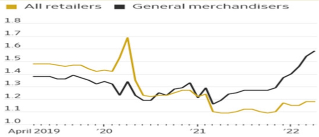 图1. 所有零售商和综合商品店的库存与销售比率。来源:美国人口普查局
