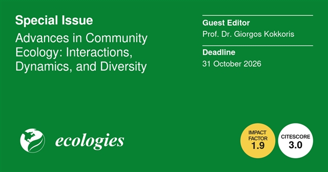 Ecologies 期刊特邀希腊爱琴海大学海洋科学系 Giorgos Kokkoris 教授担任客座编辑,合作建设特刊 Advances in Community Ecology: Interactions, Dynamics, and Diversity(群落生态学进展:相互作用、动态与多样性)。本特刊聚焦群落生态学前沿研究,整合理论建模、实验研究与野外调查,为理解和管控快速变化世界中的复杂生态系统提供预测性框架。