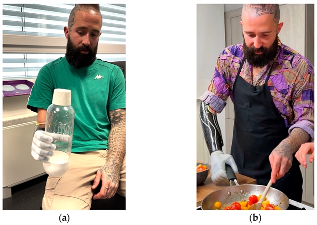 (a)患者在安装“亚当之手”的当天,就能用假手握住一个水瓶;(b)患者还能用假手拿起平底锅和木铲进行烹饪。