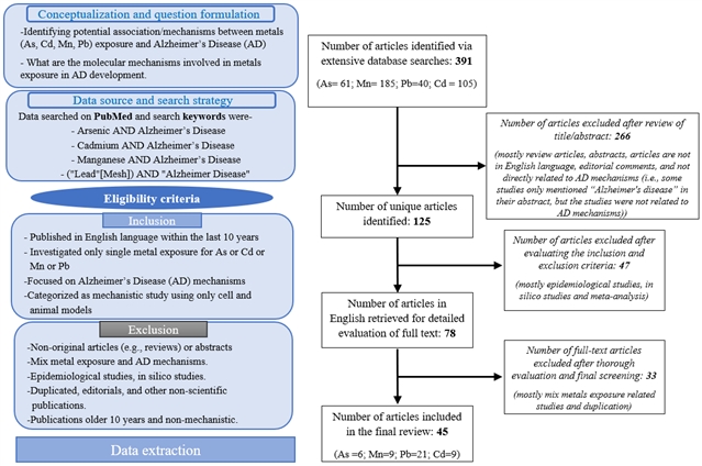 研究团队于2024年8—9月在PubMed数据库检索2014—2024年发表于英文同行评议期刊的机制研究,关键词围绕“砷/锰/铅/镉”和“阿尔茨海默病”组合设置。纳入标准强调单一金属暴露、聚焦AD机制、并限定为细胞或动物模型研究;排除流行病学研究、计算机模拟、混合金属暴露及非原创文献等。共检索到391篇文章,最终筛选得到45篇原创机制研究,涉及As 6篇、Mn 9篇、Pb 21篇、Cd 9篇。
