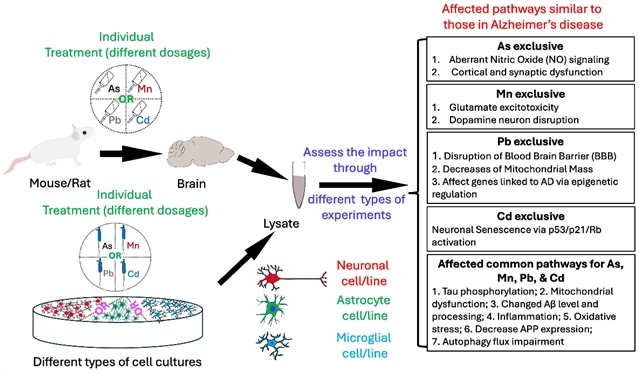 阿尔茨海默病(AD)是全球最常见的神经退行性疾病之一,随着预期寿命延长,其患病负担预计将持续上升。AD在病理S层面常见的特征包括淀粉样β蛋白(Aβ)沉积形成老年斑、异常磷酸化的tau蛋白形成神经原纤维缠结,以及神经元数量减少并引发进行性认知下降。除年龄、遗传和生活方式因素外,越来越多证据提示环境暴露也可能参与AD的发生发展。砷(As)、锰(Mn)、铅(Pb)、镉(Cd)等重金属广泛存在于生态系统中,可经饮水、食物或吸入等途径进入人体,并可能在体内累积造成神经毒性。本文旨在基于近10年细胞与动物模型的机制研究,系统总结As、Mn、Pb、Cd单一暴露与AD相关病理过程之间的关联,并梳理可能的共同与特异分子机制。