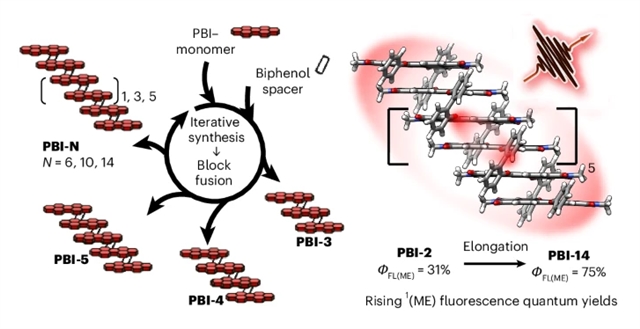 研究组介绍了一个由紧密π堆积染料组成的折叠体系列,涵盖从二聚体到十四聚体,该系列通过基于嵌段的迭代偶联方案获得,使得研究寡聚体长度对其光物理性质的影响成为可能。光谱技术揭示了在约四到六个染料单元处荧光性质发生显著转变——荧光带变窄,总量子产率从二聚体的47%提升至十四聚体的75%——同时伴随着多激子态的形成。这些结果凸显了二聚体模型的局限性,并为未来研究结构明确的π堆积折叠体提供了动力,这类体系既可作为固态材料的模型,也可作为未来电子与光子应用中的超分子导线。