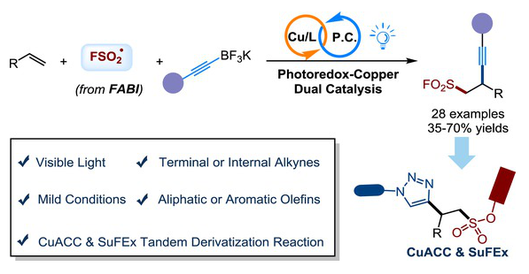 Abstract: Click chemistry has boasted remarkable connectivity in molecule synthesis. The fluorosulfonyl group is not only an important structural motif in bioactive molecules, but also serves as a useful SuFExable group in the next-generation click chemistry, sulfur(VI) fluoride exchange (SuFEx) reactions. In this study, we successfully developed a facile synthetic approach to β-ethynyl sulfonyl fluorides, by leveraging the synergistic catalysis of photoredox and metal catalysis. Both aryl and alkyl terminal olefins can be readily converted into the desired products in good yields under visible light mediation by employing an irridium photocatalyst in combination with a copper catalyst. It is worth mentioning that potassium ethynyltrifluoroborate is also an usable alkynylation reagent for this transformation, which could afford a valuable terminal alkyne group. These products feature two distinct clickable reaction sites, which allows for efficient multiple linking of molecules by integrating the classic CuAAC click reaction with the SuFEx click reaction, and is demonstrated in molecule ligation with a natural product and a drug molecule, respectively.