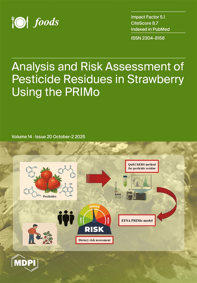 De Rosa, E.; Di Lillo, M.; Triassi, M.; Di Duca, F.; Russo, I.; Graziano, V.; Mazzei, G.; Gentile, I.; Shojaeian, S.Z.; Montuori, P. Analysis and Risk Assessment of Pesticide Residues in Strawberry Using the PRIMo Model: Detection, Public Health and Safety Implications. Foods 2025, 14, 3470. https://doi.org/10.3390/foods14203470