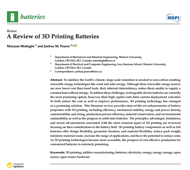 文章指出,3D打印技术为电池领域带来了设计灵活性、几何自由度和材料多样性,能够减轻电池组重量、减少浪费、拓宽应用场景,并具有降低成本的潜力。未来可以从如何实现3D打印电池大规模生产与应用的方向展开研究。