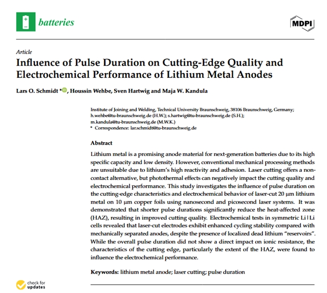 本文指出,使用超短脉冲(皮秒)激光切割锂金属负极,能显著减少加工带来的热损伤,从而提升电池的循环稳定性。