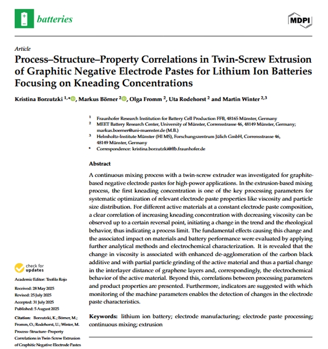 该研究揭示了在双螺杆挤出制备电池负极浆料时,提高捏合强度会先优化浆料性能,但超过临界点后,因损伤石墨结构,反而会损害最终电池性能。
