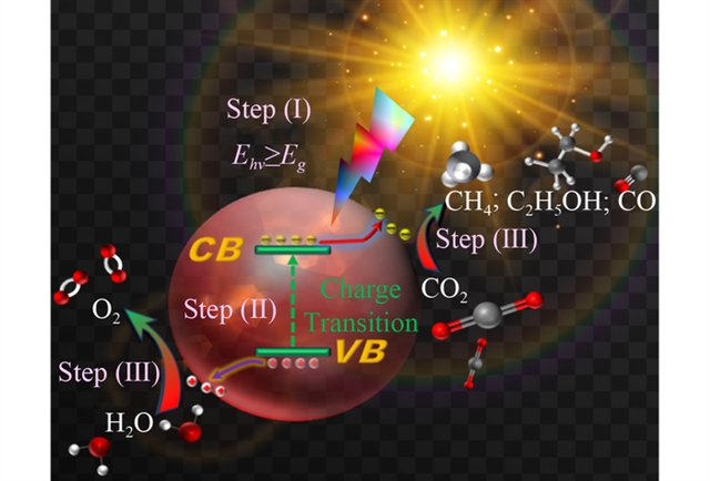 图1 光催化CO2还原过程,包括光吸收、电子跃迁以及目标产物的生成