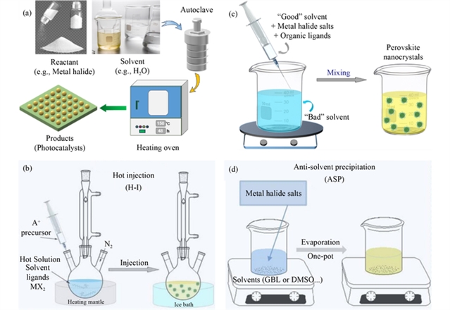 金属卤化物的合成方法直接影响其形貌、尺寸及催化性能。水热法通过高温高压环境制备高结晶度材料,如TJU-39(Pb)与TJU-40(Pb/TM)在160℃下反应48小时可获得层状结构,其CO2还原为乙醇的选择性超过了90%。热注入法(H-I)与配体辅助再沉淀法(LARP)适用于纳米晶体的可控合成,例如Cs3Bi2I9量子点通过LARP法在室温下可实现高稳定性制备。反溶剂沉淀法(ASP)则通过极性调控实现了CsAgCl2等材料的快速结晶,但存在晶粒尺寸大、结晶度低的局限性(图3)。