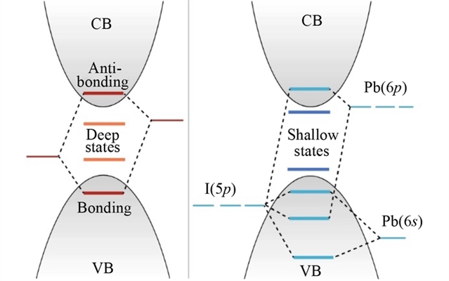 图2 本征缺陷较少的半导体(左)和本征缺陷容忍度高的材料(右)的电子结构