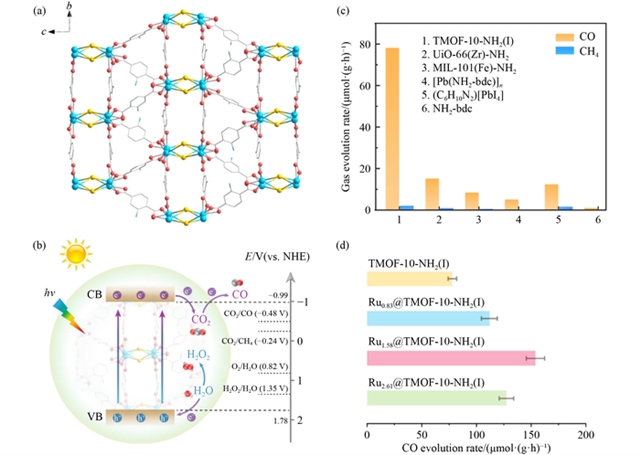 图8 对TMOF-10-NH2光催化剂的全面分析,涵盖微观分子结构、带隙定位和产物生成