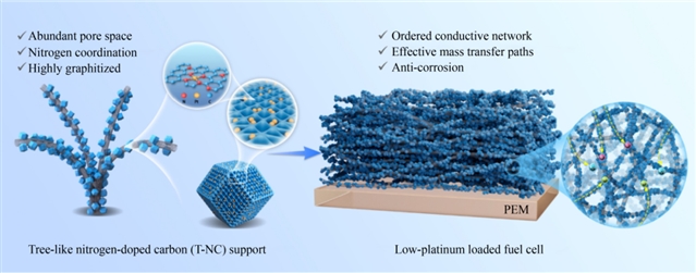 The widespread commercial adoption of fuel cells requires continued improvements in cost-effectiveness, performance, and durability. A tree-like nitrogen-doped carbon (T-NC) support structure was developed for low-platinum (Pt) loaded fuel cells. Carbon nanotubes serve as the conductive backbone, while ZIF-8-derived carbon, synthesized from 2-methylimidazole zinc salt, forms the branches that provide attachment sites for platinum group metals (PGMs). In cathodes with a Pt loading of 0.1 mgPt/cm2, this novel Pt/T-NC electrode exhibited a remarkable 30% reduction in concentration loss at 2.0 A/cm2 and a 12.7% increase in peak power density, compared to conventional Pt/C electrodes. Additionally, the corrosion resistance of the electrode was improved. Following 5000 cycles of accelerated durability testing (ADT) for carbon corrosion, the fuel cell retained 50.8% of its original performance, while conventional electrodes retained only 38%. The T-NC structure is broadly applicable for supporting various advanced PGM catalysts. This advancement offers a promising approach to bridge the gap between theoretical catalytic activity and practical output, leading to substantial improvements in both performance and durability of fuel cells.