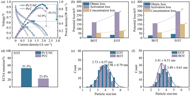 在H2/空气条件下,当阳极Pt负载0.05 mgPt/cm2、阴极0.1 mgPt/cm2时,Pt/T-NC电极的峰值功率密度达0.93 W/cm2,较商业Pt/C提升12.7%。电化学阻抗谱(EIS)分析显示,T-NC电极在2.0 A/cm2时浓度损失降低30%,归因于有序传质网络减少了氧气的传输阻力。ADT测试中,5000次循环后Pt/T-NC电极的欧姆损失、活化损失和浓度损失增幅分别为28.8%、66.5%和40.0%,显著低于Pt/C电极的49.8%、82.2%和146%;电化学活性表面积(ECSA)保留率为51.5%,是Pt/C电极的2.2倍。