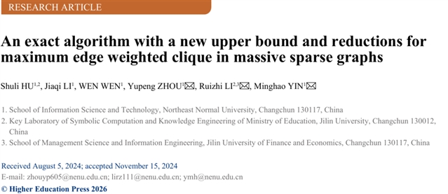 Shuli HU, Jiaqi LI, WEN WEN, Yupeng ZHOU, Ruizhi LI, Minghao YIN. An exact algorithm with a new upper bound and reductions for maximum edge weighted clique in massive sparse graphs. Front. Comput. Sci., 2026, 20(6): 2006402