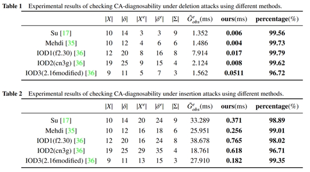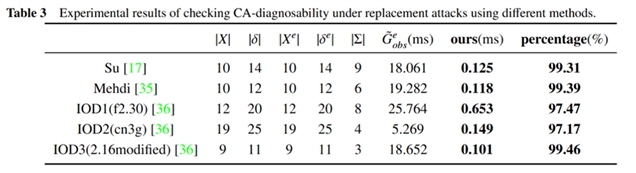 下表分别展示了该文的方法以及传统方法在三种静态攻击下判断CA – 可诊断性效率的实验结果。