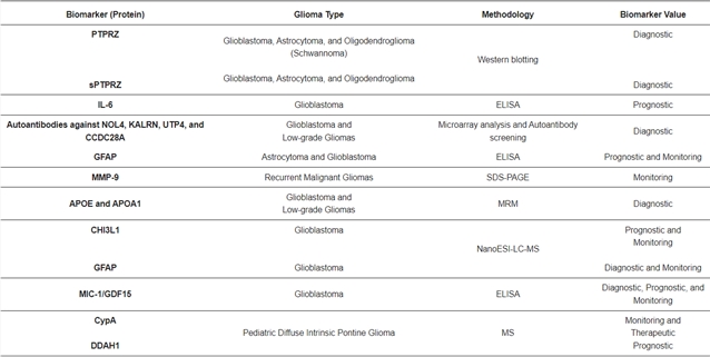 蛋白质在肿瘤存活和生长中的关键作用使其成为重要的生物标记物,具有作为胶质瘤监测工具的巨大潜力(表1)。