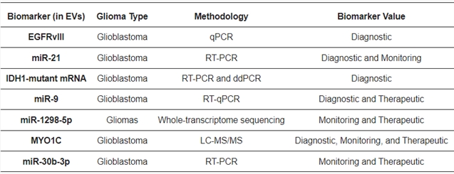 EVs是细胞衍生的囊泡,能够将多种生物分子定向转运到特定的受体细胞。三种主要的EVs类型是微囊泡、外泌体和凋亡体。EVs作为胶质瘤的诊断和监测方法已被广泛研究(表2)。