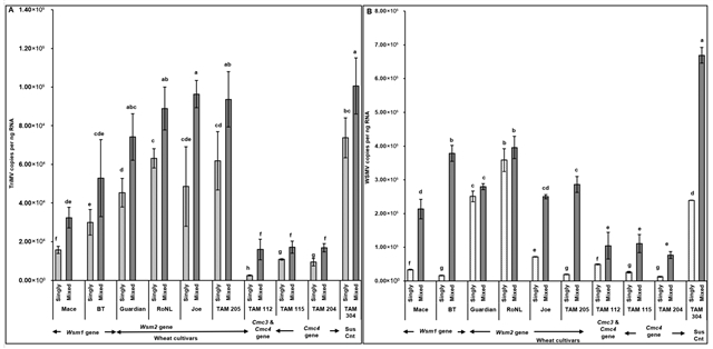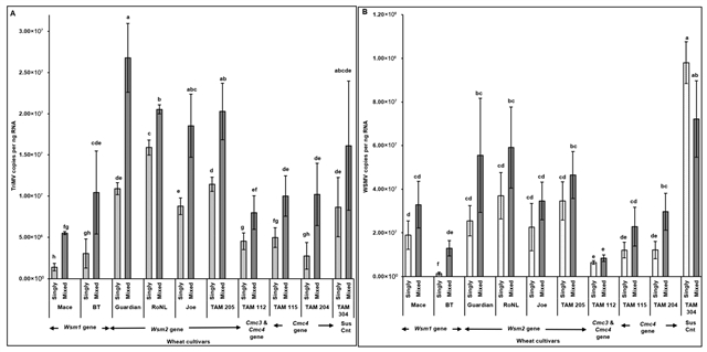 图6 不同遗传特性的小麦植株感染了TriMV和/或WSMV后,取食螨虫体内病毒的积累情况