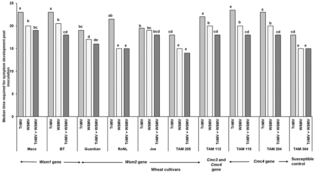 图1 不同品种小麦植株在感染带病毒的螨虫后出现小麦条纹花叶病特异性症状所需的中位时间