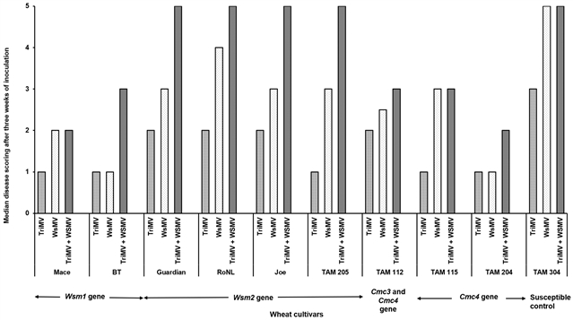 所有品种中,混合感染(WSMV+TriMV)引起的病害严重度评级最高(图2)。其中,携带Wsm2基因的品种在混合感染下的病害严重度尤为突出,而携带Wsm1Cmc3/Cmc4基因的品种,病害症状相对较轻。