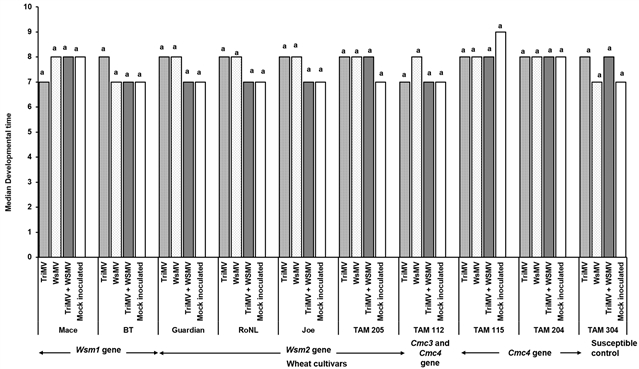 图4 未感染和感染(TriMV和/或WSMV)的不同遗传背景的小麦植株上小麦卷叶螨的发育时间