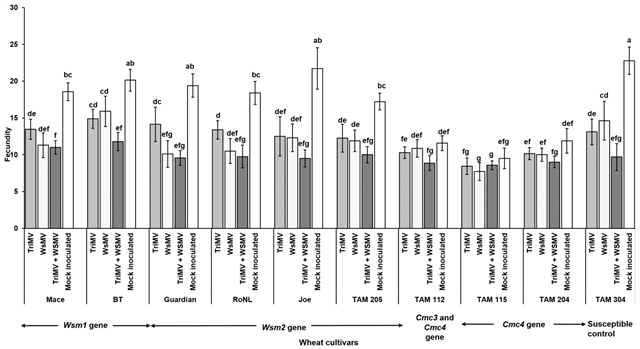 图5 未感染和感染(TriMV和/或WSMV)的不同遗传背景的小麦植株上小麦卷叶螨的繁殖力