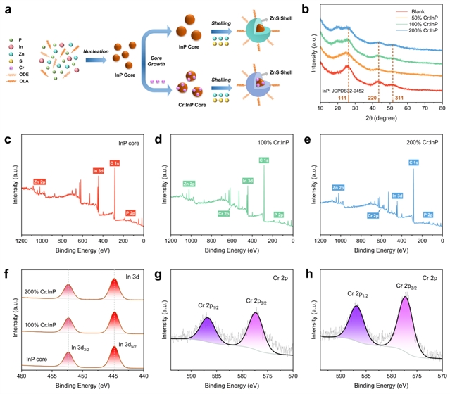 图1 Cr掺杂InP量子点的生长过程及结构表征:(a) InP/ZnS量子点和Cr:InP/ZnS量子点生长过程的示意图;(b) 不同Cr掺杂量的InP量子点的X射线衍射(XRD)图谱;(c) InP量子点、(d) 100% Cr:InP量子点、(e) 200% Cr:InP量子点的X射线光电子能谱(XPS)全谱;(f) In 3d高分辨XPS谱;(g) 100% Cr:InP量子点、(h) 200% Cr:InP量子点的Cr 2p高分辨XPS谱。