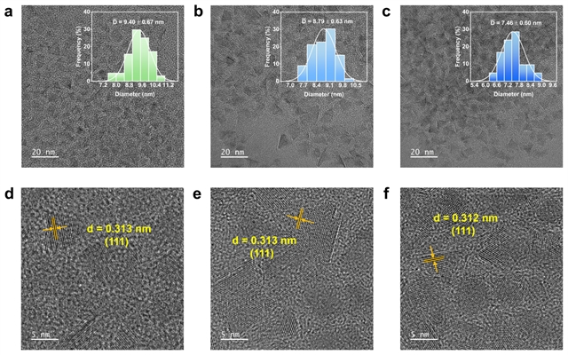 图3 Cr:InP/ZnS量子点的形貌与晶体结构表征:(a) InP/ZnS量子点、(b) 100% Cr:InP/ZnS量子点、(c) 200% Cr:InP/ZnS量子点的透射电子显微镜(TEM)图像(插图为对应的尺寸分布直方图);(d) InP/ZnS量子点、(e) 100% Cr:InP/ZnS量子点、(f) 200% Cr:InP/ZnS量子点的高分辨透射电子显微镜(HRTEM)图像。